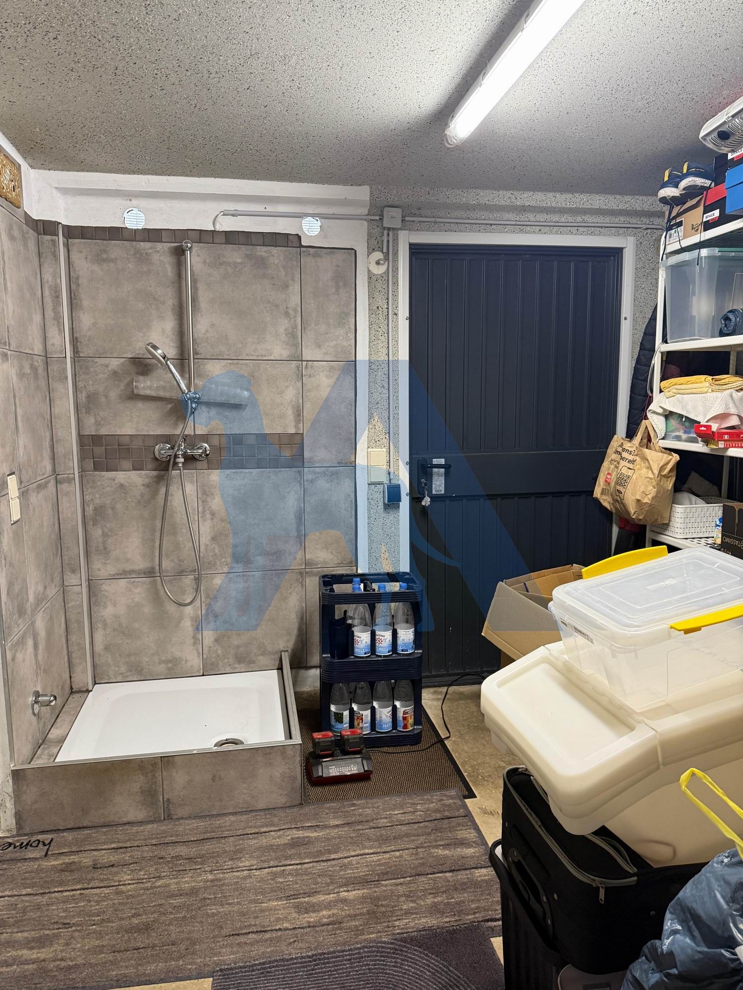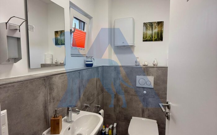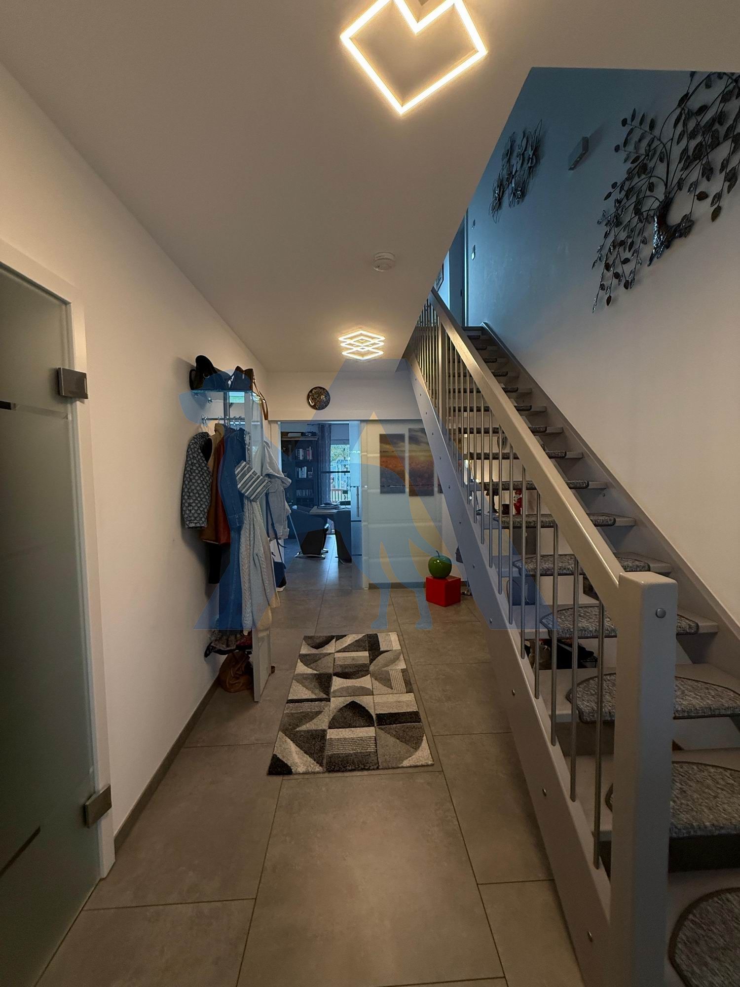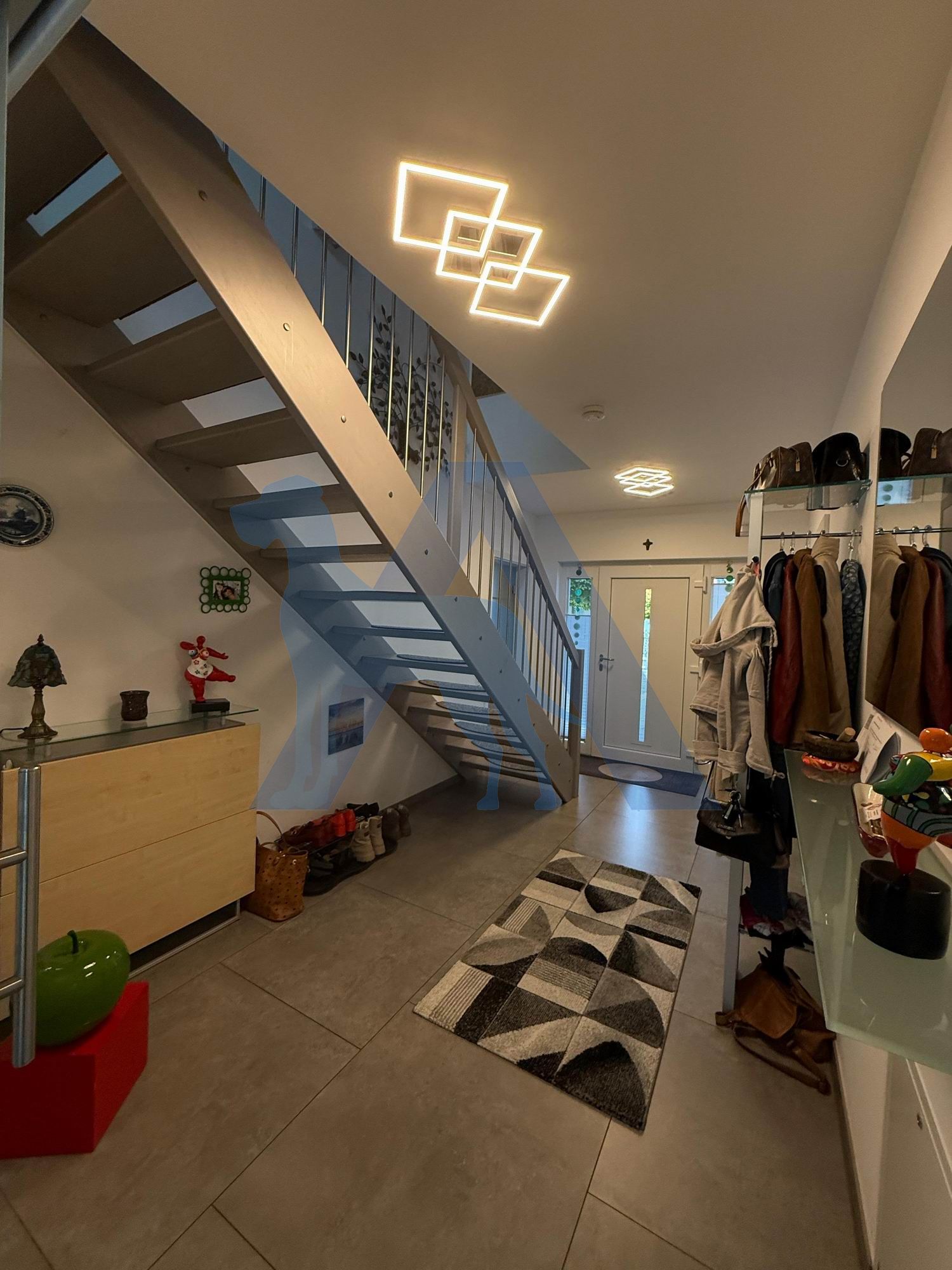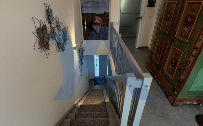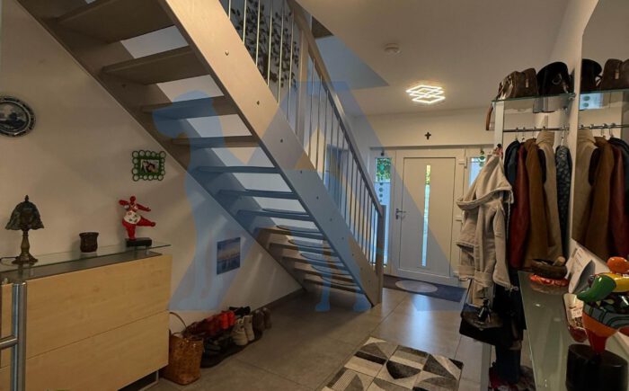 Das Haupthaus bietet im EG einen hellen Eingangsbereich. Von diesem gehen das Gäste-WC mit Dusche, sowie ein Hausanschlussraum mit direktem Zugang in die Garage ab.