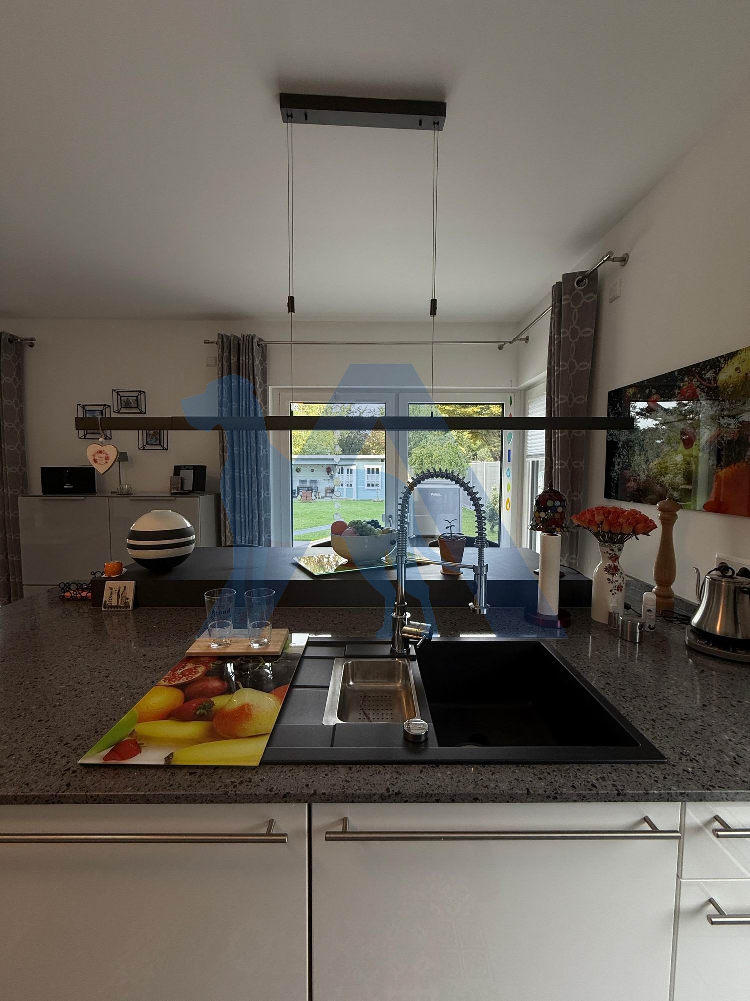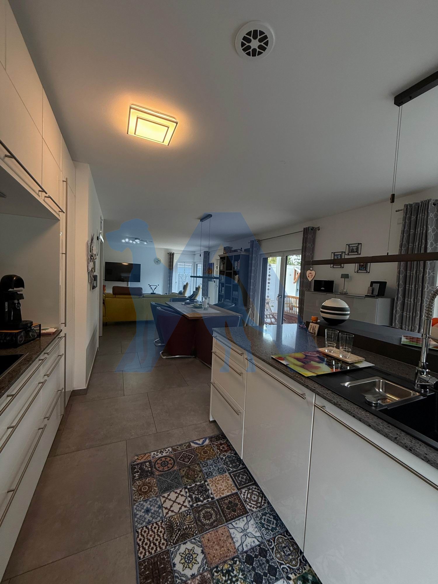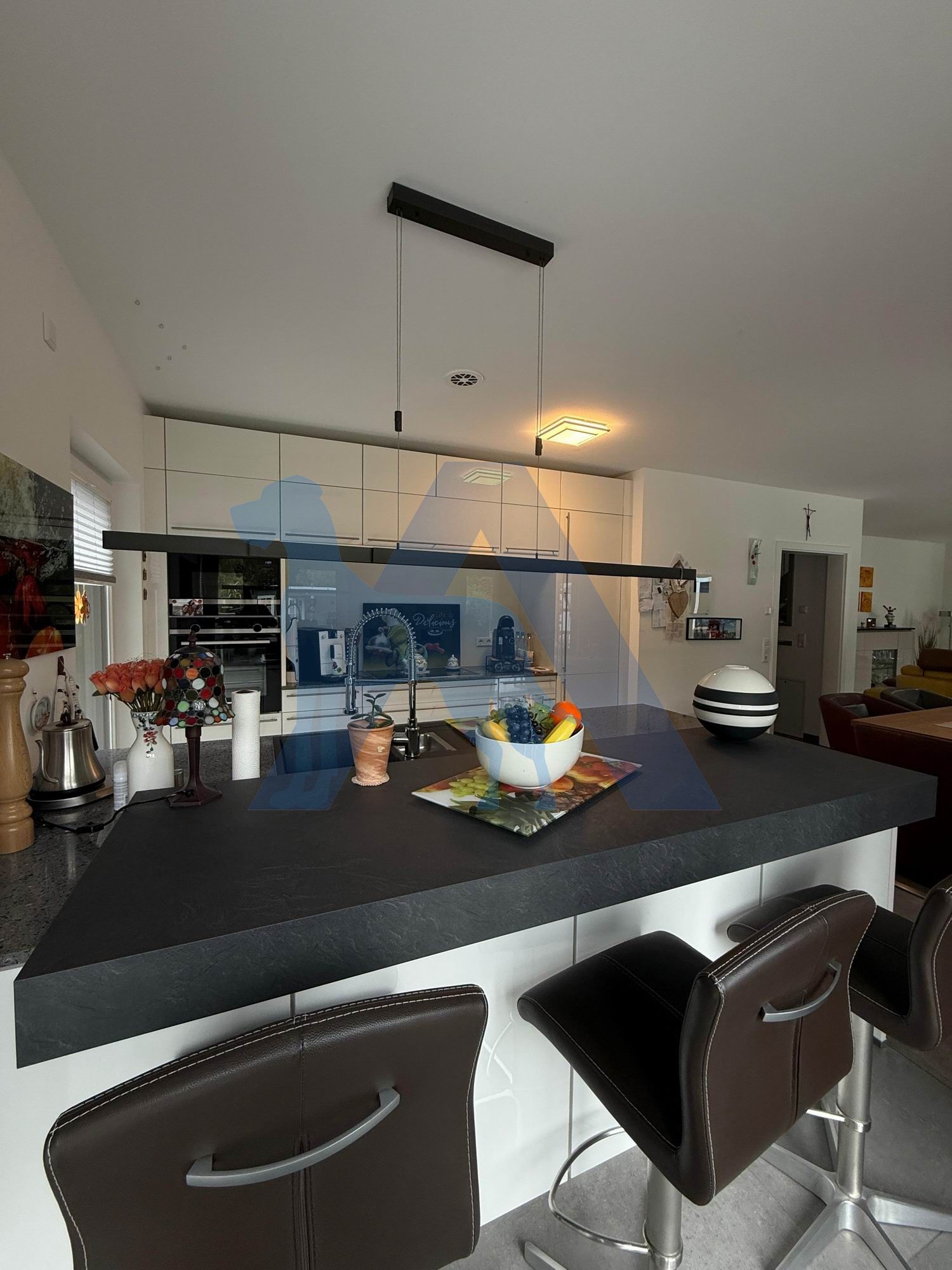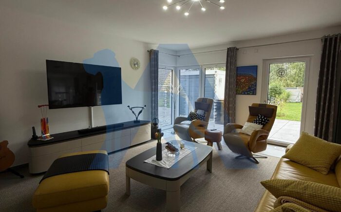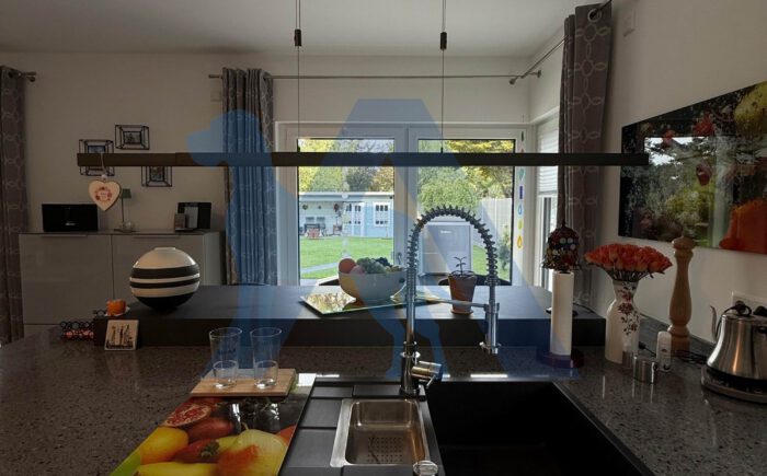 Der luxuriöse Wohnbereich mit moderner Küche, bodentiefer Fensterfront und Zugang in die traumhafte Gartenanlage schenken Raum zur Entspannung.